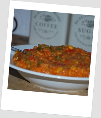 Die roten Linsen in 4 Tassen Gemüsebrühe kochen (ca. 10 min.). Die Zwiebel in einem anderen, großen Topf anbraten und die Paprikawürfel sowie die grünen Bohnen zugeben. Dann die gehackten Tomaten dazugeben und würzen. Den Knoblauch reinpressen. Den Mais und die roten Linsen erst am Schluss.